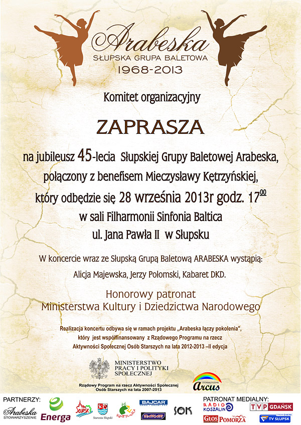 Słupską Grupę Baletową Arabeska założyli w 1968 roku Mieczysława Kętrzyńska oraz Stanisław Kątnik. Arabeska, to 20-to osobwa żeńska grupa taneczna odznaczająca się jednakowym wzrostem i długością nóg, w jednakowych kostiumach, w wieku od 13 do 30 lat. Arabeska, to znakomity przykład zespołu młodzieżowego, taneczno – baletowego, na który wciąż istnieje ogromne zapotrzebowanie. Kilka tysięcy popisów estradowych na scenach całego kraju oraz za granicą, w tym kilkaset koncertów przed kamerami Telewizji Polskiej, Rosyjskiej, Bułgarskiej i NRD, udział w dwóch filmach fabularnych (Bezkresne łąki, Koniec sezonu na lody) i w wielu eksponowanych imprezach centralnych. Setki bardzo pochlebnych opinii prasowych oraz powszechne uznanie fachowców dla kunsztu warsztatowego grupy – to osiągnięcia, których mógłby pozazdrościć ARABESCE niejeden zespół zawodowy. Dokonania w okresie minionych lat są jednocześnie miarą talentu i pasji artystycznej jej twórców, instruktorów i opiekunów oraz umiejętności i zaangażowania wszystkich jej młodych członkiń. Arabeska, to godny pochwał ambasador w dziedzinie kultury i sztuki. W światowym konkursie w Brazylii w 1997r, stylizowany kostium szlachecki Arabeski (wg projektu Kosy Gustkiewicz), został uznany za najpiękniejszy kostium ludowy.
